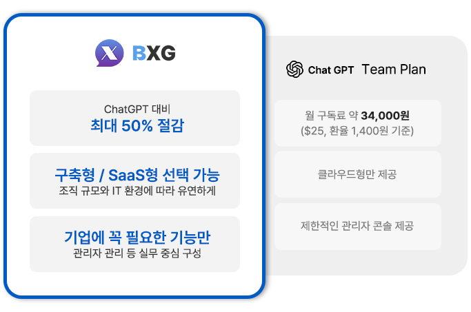 BXG는 기업 고객의 데이터를 안전하게 지키는 보안 중심형 AI 솔루션입니다.